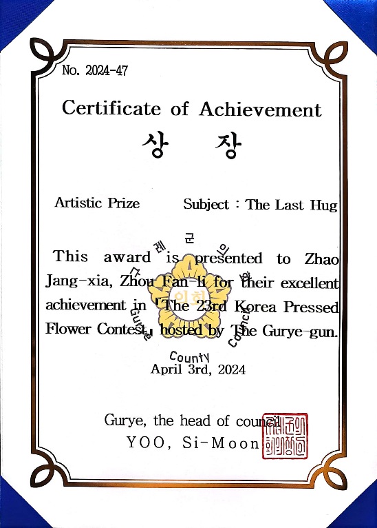 近日,第23届韩国国际压花比赛颁奖典礼在韩国邱礼举行,我校师生作品再获殊荣。由廖静老师指导的2021级园林专业钟青娥作品“橱窗里的母亲”获二等奖,2021级园林专业赵江霞同学与周凡力老师合作作品“最后的拥抱”获艺术奖。